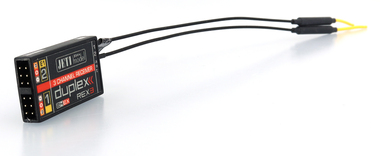 3-kanálový plochý přijímač s anténními svody prodlouženými na 20 cm a dvěma nastavitelnými výstupy E1, E2. Nastavitelné výstupy podporují funkce servo, JETIBOX/Senzor EX, PPM výstup, PPM vstup, EX Bus výstup, UDI výstup a S.BUS.