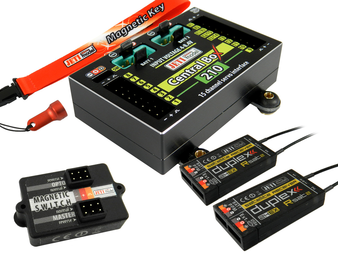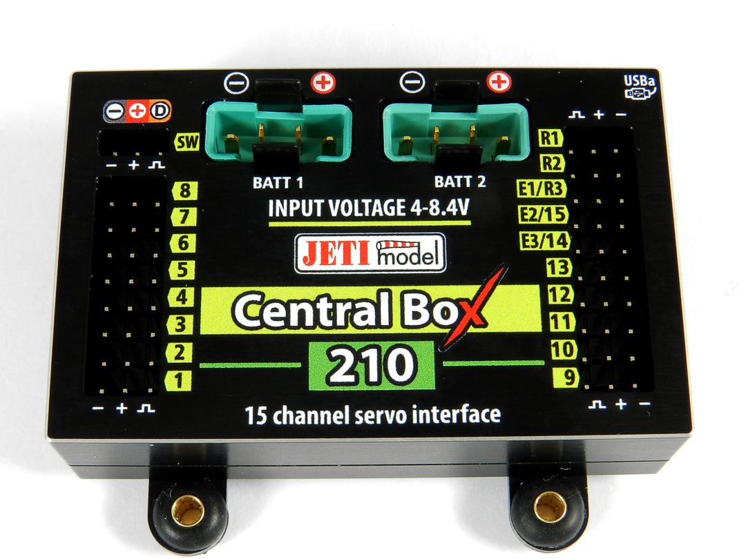 Central Box je zařízení, navržené pro kompletní management serv v modelu s důrazem na bezpečnost. Central Box 210 nabízí maximální neredukovaný proud pro každé servo (servo výstupy neobsahují ochranu proti přetížení). Central Box nabízí možnost napájení až dvěma bateriemi a plně podporuje telemetrický systém JETI EX. K Central Boxu 210 lze připojit až tři přijímače se sériovým výstupem (PPM, EX Bus, S.BUS, UDI). S vysílačem JETI DC/DS lze maximálně využít možností Central Boxu, jako jsou např. komfortní způsob konfigurace Central Boxu, telemetrie EX a velice rychlé reakce serva.
